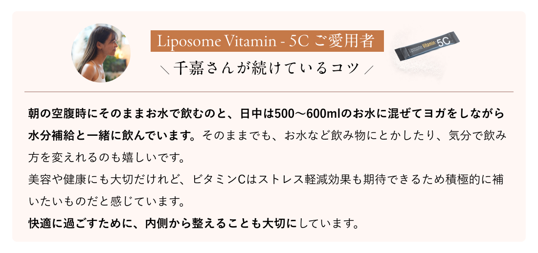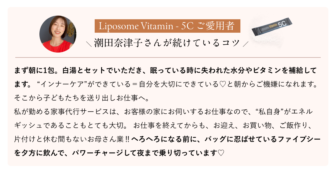 Liposome Vitamin - 5Cは、気づかないうちに失っていた栄養をすみずみまで満たし、健康で美しい日々へと導きます。