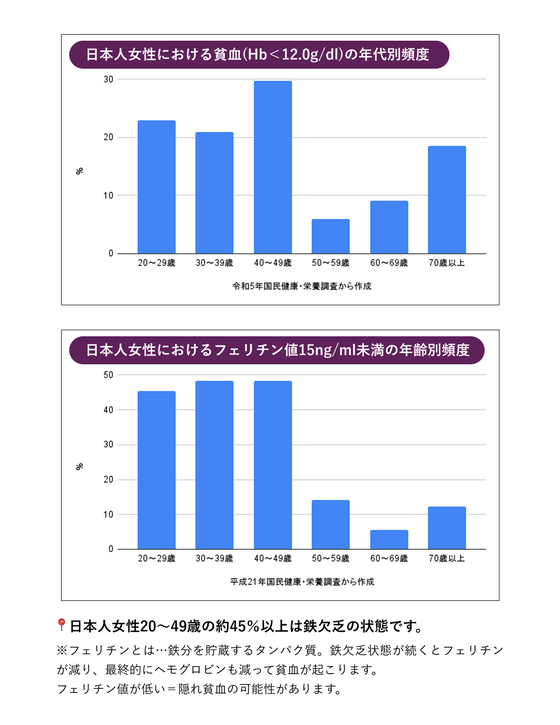 実際、日本人女性20代〜40代における貧血の割合は約25%、貧血まではいかないものの約半数が鉄欠乏の状態にあると言われていて、鉄欠乏に気づけていない人も多いようです。